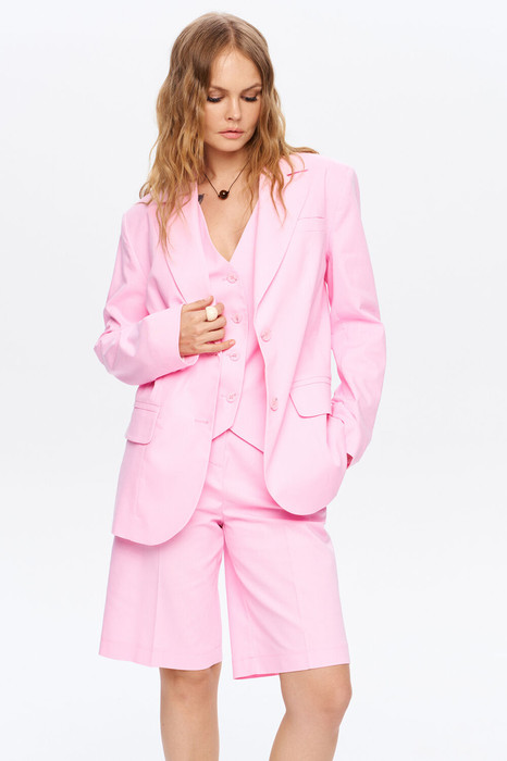 Льняной костюм-двойка из оверсайз жакета и шорт-бермуд.