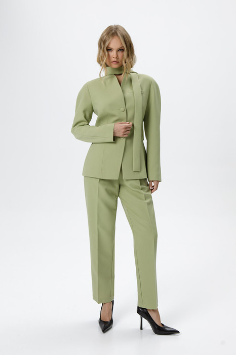 Костюм-двойка из приталенного жакета с акцентными плечами и укороченных классических брюк со стрелками.
