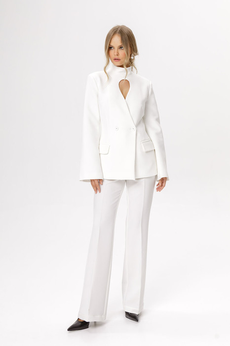 Костюм-двойка из приталенного жакета с фигурным вырезом-каплей и прямых широких брюк со стрелками.
