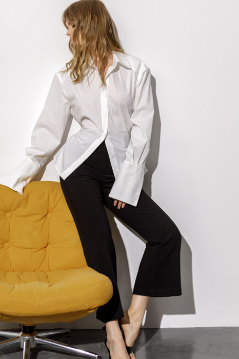 Детали: рубашка приталенного силуэта, расширенная линия плеча, кокетка по переду и спинке, длинный рукав с широкой притачной манжетой, рубашечный воротник, центральная потайная застёжка на 7 пуговиц, петли в боковых швах. Брюки клёш с притачным поясом со шлёвками, передние половины с заутюженными стрелками, застёжка на молнию и потайной крючок, наклонные карманы в боковых швах, задние половины брюк с вытачками и заутюженными стрелками. Пояс брюк без резинки.