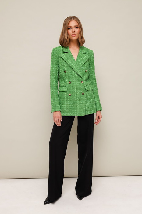 Стильный комплект, состоящий из жакета и брюк. Жакет современного прямого силуэта из ткани шанель в клетку. Воротник пиджачного типа с отложными лацканами. Двубортная застёжка на петли и пуговицы, спереди обработаны карманы в рамку с клапанами. Рукава двухшовные с отлетной шлицей по низу с имитацией застежки на пуговицы. Изделие на подкладке. Брюки прямого силуэта из костюмной ткани с заутюженными стрелками. Пояс притачной с застежкой на петлю и пуговицу, по спинке пояса обработана резинка для регуляции размера.
