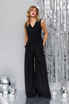 Жакет современного прямого силуэта из костюмной ткани с центральной застёжкой на петли и пуговицы. Воротник пиджачного типа с отложными лацканами. Спереди обработаны накладные карманы. Спинка с V-образным вырезом, который зашнурован акцентной декоративной тесьмой. Рукава втачные, длина 3/4. Изделие на х/б подкладке.