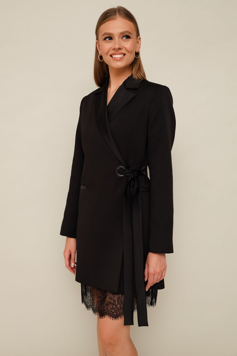 Нижнее платье-комбинация полуприлегающего силуэта. V-образный вырез горловины. Перед с нагрудными вытачками. Бретели регулируются по длине. По низу платья выполнена отделка в виде настрочного кружева. Лацканы, карманылисточки, завязки в области талии и нижнее платье-комбинация выполнены из гладкой ткани с благородным матовым блеском.