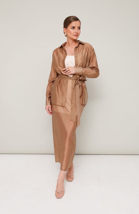 Элегантный 3-предментный комплект, состоящий из топа, блузки и юбки.