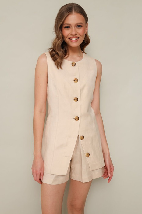 Стильный 2-предметный костюм, состоящий из жилета и шорт, выполнен из натурального льна. Жилет актуального прямого силуэта с центральной застежкой на петли и пуговицы. В рельефных швах спинки обработаны завязки для регуляции прилегания жилета. Шорты с притачным поясом на резинке и боковыми наклонными карманами. Спереди шорт - имитация гульфика.