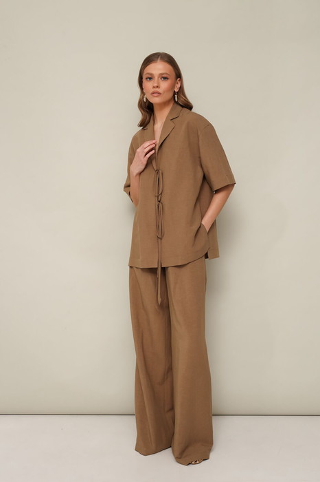 Расслабленный 2-предметный комплект актуального кроя, состоящий из блузки и брюк. Блузка прямого силуэта с центральной застежкой на завязки. Рукава короткие, со спущенной линией втачивания плеча. В боковых швах по низу обработаны разрезы. Брюки прямого силуэта с притачным, отстроченным поясом на резинке и с боковыми наклонными карманами. Спереди брюк - имитация гульфика.
