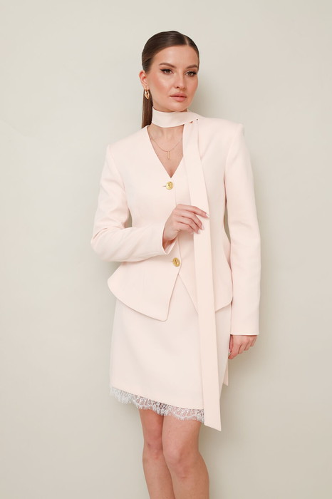 Комплект, состоящий из жакета, юбки и шарфа, выполнен из костюмной ткани.