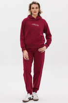 Спортивный костюм выполнен из хлопкового трикотажного полотна. Куртка с капюшонам на молнии. Рукава покроя реглан Пояс куртки и манжеты рукавов выполнены из эластичного полотна. Карманы в куртке - в рельефах, с потайной молнией. Слева на груди вышивка, спинке - принт. Брюки зауженные. Пояс брюк из эластичной рибаны. Ширина пояса дополнительно фиксируется шнуром. Боковые карманы брюк - "хулиганы". На левом рукаве, в области манжеты и на левой половине брюк нанесен термотрансфер с фирменным логотипом.