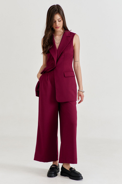 Комплект, состоящий из жилетки и брюк. Жилетка полуприлегающего силуэта, длиной ниже линии бедер. Спинка со средним швом, с рельефами от пройм до низа. Перед с нагрудной вытачкой, рельефом и прорезным карманом с клапаном и обтачками. На левом переде, в области груди обработан карман-обманка с листочкой. Воротник пиджачного типа с лацканом. Застежка на петлю и пуговицу. Жилетка на подкладке. Брюки укороченные, длиной выше щиколотки, прямого силуэта, на притачном поясе с резинкой по спинке. По задним половинкам талиевые вытачки. По передним половинкам заложены односторонние складки, обработаны боковые карманы с наклонным входом, и застежка на тесьму-«молнию» с гульфиком и откоском. По поясу застежка на петлю и пуговицу. По поясу вставлены шлевки.