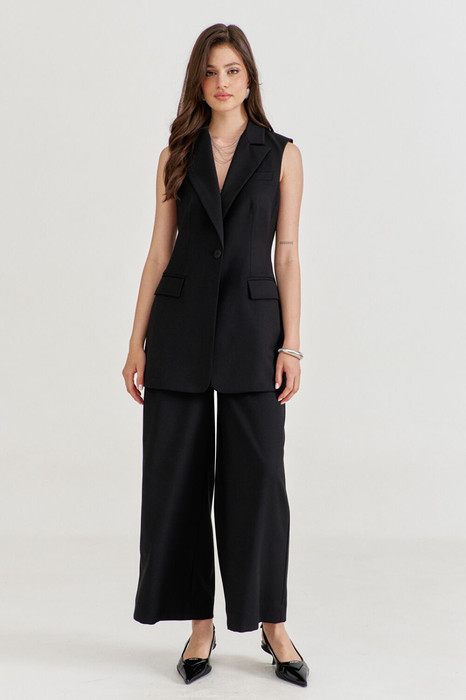 Комплект, состоящий из жилетки и брюк. Жилетка полуприлегающего силуэта, длиной ниже линии бедер. Спинка со средним швом, с рельефами от пройм до низа. Перед с нагрудной вытачкой, рельефом и прорезным карманом с клапаном и обтачками. На левом переде, в области груди обработан карман-обманка с листочкой. Воротник пиджачного типа с лацканом. Застежка на петлю и пуговицу. Жилетка на подкладке. Брюки укороченные, длиной выше щиколотки, прямого силуэта, на притачном поясе с резинкой по спинке. По задним половинкам талиевые вытачки. По передним половинкам заложены односторонние складки, обработаны боковые карманы с наклонным входом, и застежка на тесьму-«молнию» с гульфиком и откоском. По поясу застежка на петлю и пуговицу. По поясу вставлены шлевки.