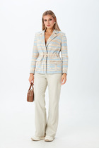 Комплект, состоящий из жилетки, топа и брюк. Жилетка свободного кроя, длиной выше колена. Спинка со средним швом, в котором обработан разрез. Перед с нагрудной вытачкой. Пройма глубокая, квадратной формы. Воротник пиджачного типа со стойкой. Жилетку дополняет шифон по спинке и переду. Жилетка без застежки на подкладке. Топ на бретелях, двойной, длиной выше бедер, с неровной линией низа (спинка удлинена). По переду топа нагрудные вытачки. Брюки длинные, широкие, на притачном поясе с резинкой. По спинке талиевые вытачки. По переду, с правой стороны, вставлена деталь из шифона, выполнена в виде запаха, которая крепится с левой стороны при помощи пояска и паты с полукольцами. В боковых швах обработаны карманы.