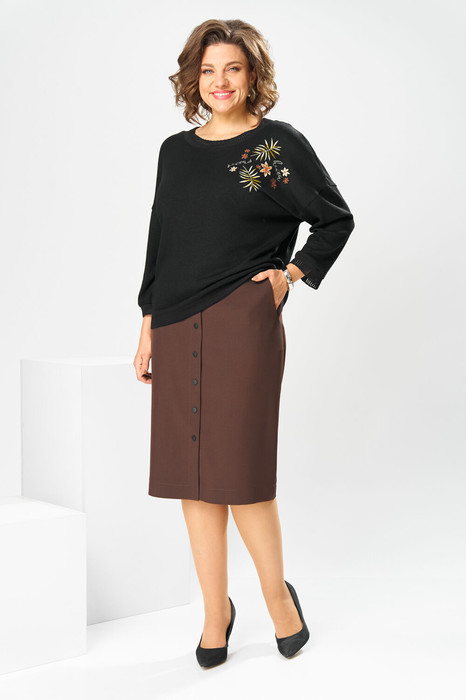Костюм женский двух предметный: джемпер и юбка предназначен для повседневной носки. Джемпер прямого силуэта, длиной до линии бедер. Перед цельнокроеный, декорирован худ. Вышивкой. Спинка цельнокроеная. Горловина круглая, с втачной фигурной планкой из отделочной ткани. Джемпер со спущенной проймой. Рукав втачной, одно шовный, длиной 7/8. Юбка прямая, длиной ниже колена. Переднее полотнище с двумя боковыми фигурными карманами. Заднее полотнище с двумя таллиевыми вытачками. Застежка спереди на 8 металлических кнопок. Верхний срез с притачным поясом, с 4 надстрочными шлевками, между карманами и вытачками заднего полотнища пояс собран на эластичную тесьму. Юбка на подкладке. Длина джемпера 53см, длина рукава от горловины 58см. Длина юбки 68см