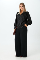 Костюм женский относится к нарядной торжественной одежде состоит из блузки и юбки. Блузка полуприлегающего силуэта, длиной до линии бедер. Перед с двумя нагрудными вытачками, с притачной планкой по горловине из отделочной ткани. Спинка с отрезной кокеткой, декорированной настрочным кружевом с двумя завязками, фиксирующимися по горловине в бант. Горловина с V-образным вырезом обработана косой бейкой. Рукав втачной, короткий, одно шовный со сборкой по окату. Блузка без плечевых накладок. Юбка полу солнце, длиной до середины икры. Переднее полотнище с двумя односторонними складками, с карманами в боковых швах. Заднее полотнище цельнокроеное. Застежка на потайную тесьму-молнию в левом боковом шве. Юбка с притачным поясом с застежкой на пришивную пуговицу. Пояс с двумя настрочными шлевками. Длина блузки 62 см. Длина рукава 20.5 см. Длина юбки 75 см
