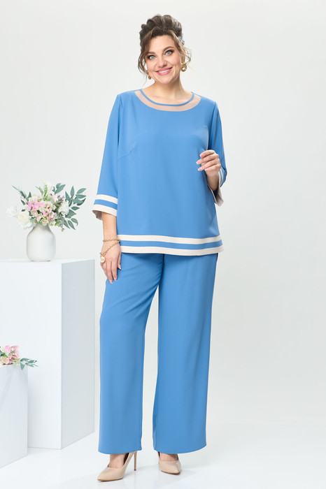 Костюм женский, относится к торжественной одежде. Костюм женский 2-х предметный, блузон и брюки. Блузон женский прямого силуэта, длиной ниже линии бёдер. Перед с 2-мя нагрудными вытачками, с декоративной вставкой по горловине, с горизонтальным подрезом внизу, с чередованием горизонтальных вставок из отделочной ткани. Спинка вверху с разрезом "капелькой"обработанным косой бейкой, фиксирующимся на 1-ну навесную петлю и 1-ну пришивную пуговицу. Горловина круглая, без воротника, обработана косой бейкой. Рукав втачной, одношовный, длиной 3/4, с притачной манжетой с чередованием горизонтальный вставок из отделочной ткани. Боковые швы с разрезами, низ фигурный, низ фигурный "ступенька". Блузон с плечевыми накладками. Брюки женские прямые, длинные. Передние половинки с карманами в боковых швах. Задние половинки с таллиевым вытачками. Брюки с притачным поясом, собранным на эластичную тесьму, закреплённую 2-мя отделочными строчками. Длина брюк по боковому срезу 103 см. Длина спинки блузона 74 см, длина рукава 47 см.