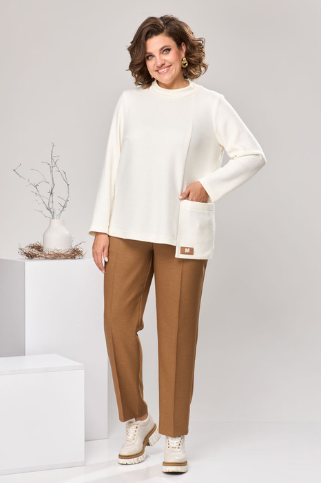 Костюм женский предназначен для повседневной носки. Костюм женский (модель) 2-х предметный джемпер и брюки. Джемпер женский прямого силуэта, длиной до линии бёдер. Перед с 2-й нагрудной вытачкой, с 1-ним отрезным рельефом, с цельнокроеным накладным карманом, декорированным настрочной аппликацией. Спинка цельнокроеная. Горловина круглая с втачной планкой-стойкой. Рукав втачной, одно шовный, длинный. Джемпер с плечевыми накладками. Брюки длинные, слегка заужены к низу. Передние половинки с карманами в боковых швах. Задние половинки с таллиевыми вытачками. Брюки с притачным поясом, собранным на эластичную тесьму. Длина брюк по боковому срезу 101 см. Длина спинки джемпера 64 см, длина рукава 59 см.