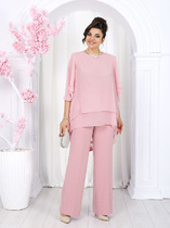 Костюм женский, 2ух-предметный, блузон и юбка. Блузон женский, прямого силуэта, длиной до линии бёдер. Перед с 2-мя нагрудными вытачками, с отделочной планкой по горловине. Спинка цельнокроеная. Горловина круглая, без воротника, обработана косой бейкой из отделочной ткани шириной 1,2 см. Блузон со спущенным плечом. Рукав втачной 2-х шовный, длиной 3/4. Срезы верхнего шва обработаны косой бейкой из отделочной ткани шириной 1,2 см и закреплены частично на планке, верхний шов заканчивается разрезом. Юбка женская "карандаш" длиной до нижней части икры. Переднее полотнище с карманами в боковых швах, со средним швом, заканчивающимся разрезом, срезы среднего шва обработаны косой бейкой из отделочной ткани, шириной 1,2 см и закреплены на планке. Заднее полотнище с 2-мя таллиевыми вытачками. Юбка с притачным поясом, собранным на эластичную тесьму, закреплённую 2-мя отделочными строчками. Юбка на подкладке. Длина юбки по боковому срезу 88 см. Длина спинки блузона 57 см, длина рукава 44 см.