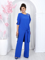 Брючный комплект из костюмной ткани на подкладке. Двубортный жакет полуприталенного силуэта с отрезными бочками и вытачками по переду и спинке. Воротник-с отложными лацканами пиджачного типа. По переду - прорезные карманы с клапанами. Рукава длинные, двухшовные. Жакет застегивается на две пуговицы. Брюки-клеш, плотно сидящие по фигуре, с началом расширения 5см выше колена. Брюки с карманами по переду и обтачкой-поясом. Застегиваются по переду на молнию и пуговицу.
