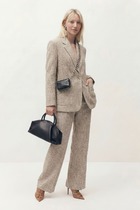 Двубортный жакет прямого силуэта с вытачками по переду. Карманы с листочками. Воротник - пиджачного типа. В среднем шве спинки - планка, застегивающаяся на пуговицы. Рукава - втачные, двухшовные. Застежка на 2 пуговицы и одну потайную. Цветок-брошь входит в комплект. Широкие брюки с поясом и карманами. По бокам пояса-резинка.Застегиваются по переду на молнию и пуговицу.