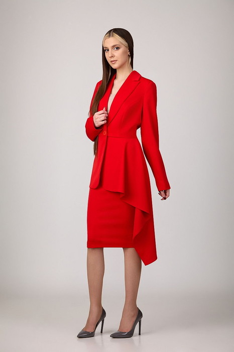 Жакет приталенного силуэта с рельефами по переду и спинке, отрезной по линии талии, с роскошной асимметричной баской.  Воротник с отложными лацканами пиджачного типа. Рукава - втачные,  двухшовные.  Жакет застегивается на одну пуговицу.