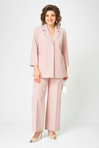 Брючный комплект из костюмной ткани на подкладке. Двубортный жакет полуприталенного силуэта с отрезными бочками и вытачками по переду и спинке. Воротник-с отложными лацканами пиджачного типа. По переду - прорезные карманы с клапанами. Рукава длинные, двухшовные. Жакет застегивается на две пуговицы. Брюки узкие, с двумя карманами и поясом-обтачкой. Застегиваются на молнию по переду и одну пуговицу.