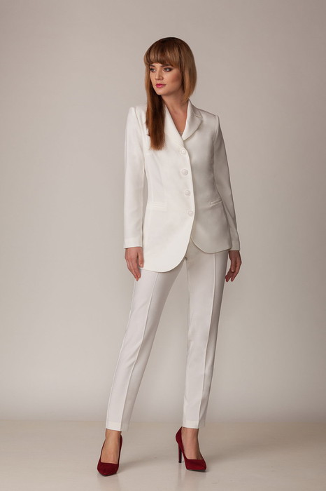 Стильная брючная пара из костюмной ткани на подкладке. Жакет слегка притален, с рельефами по переду и спинке и прорезными карманами с листочками  по переду. Воротник-английский, рукава - двухшовные. Низ переда и спинки жакета асимметричен. Шлица на спинке декорирована пуговицами. Жакет застегивается на пуговицы.  Классические брюки  слегка заужены к низу, с поясом.  Застегиваются на молнию по переду и  одну пуговицу.