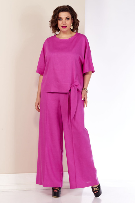 Стильный летний комплект двойка, состоящий из блузы и брюк. Блуза свободного силуэта, с притачным широким поясом на завязку. Вырез горловины округлой формы. Рукав цельнокроеный. Спинка с центральным швом.