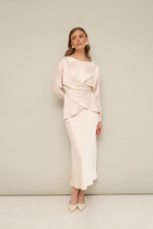 Костюм женский из трикотажного гладкокрашенного полотна «кулирка с лайкрой», состоящий из футболки и бридж. Футболка свободного покроя, со спущенным плечом и втачными рукавами длиной до локтя, горловиной овальной формы, обработанной втачной планкой и принтом на полочке, выполненным в технике «шелкографии». В нижней части боковых швов – разрезы.Бриджи – классического покроя, на резинке.