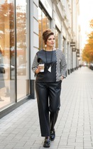 Брюки прямые зауженные книзу с отворотом. Пояс притачной на широкой резинке.