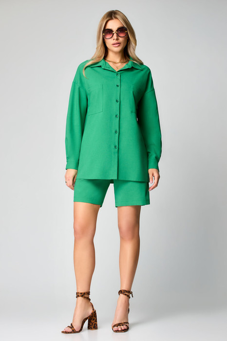 Рубашка свободного прямого кроя с втачным спущенным рукавом. По переду в верхней части накладные карманы. Застежка центральная на 8 петель и пуговиц. Воротник отложной на стойке. В боковых швах обработаны разрезы. Рукав длинный, по низу притачная манжета с застежкой на 2 петли и пуговицы.