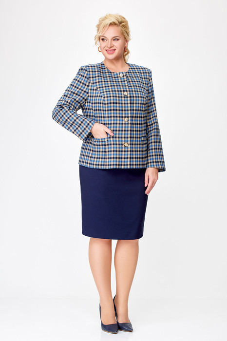 Комплект 2-х предметный, состоящий из жакета и юбки. Жакет однобортный на подкладке. По переду обработаны рельефы и прорезные карманы с листочкой. Спинка со средним швом и рельефами. Рукав втачной двухшовный с обтачной шлицей в локтевом шве. На шлицах рукавов пришиты по три декоративные пуговицы. Горловина обработана обтачкой. Застежка на 4 пробивные петли и 4 пуговицы. Длина по спинке 60 (+-1) см., длина рукава р-р 52-56 - 60 (+-1) см.,