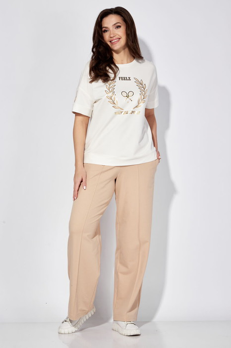 Комплект женский, 2х предметный, состоящий из свободной футболки и брюк. Футболка прямого силуэта с коротким рукавом. Рукав со спущенной линией плеча, по низу с манжетой, по центру задекорирован отделочной тесьмой с полукольцом. Горловина круглой формы с подрезной бейкой. Перед задекорирован принтом. По низу отрезная планка. По спинке кокетка и настрочная деталь с открытым срезом, задекорированная принтом. Брюки-палаццо. По переду застрочены защипы "стрелки". Карманы в боковых швах. Пояс цельнокроеный с резинкой по кругу. По переду петли и отделочная тесьма.