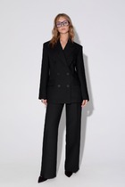 Комплект женский, 2х предметный, состоящий из рубашки и брюк. Рубашка прямого силуэта с длинным рукавом. Рукав двухшовный, со спущенной линией плеча, по низу на манжете. Застежка манжеты на кнопку. Горловина оформлена рубашечным воротником. Застежка центральная на кнопки. Перед задекорирован вышивкой с паетками. По спинке кокетка с отделочной нашивкой. Низ рубашки разноуровневый, по спинке длиннее. По бокам разрезы. Брюки прямые, с накладными карманами спереди. Пояс притачной с резинкой по кругу.