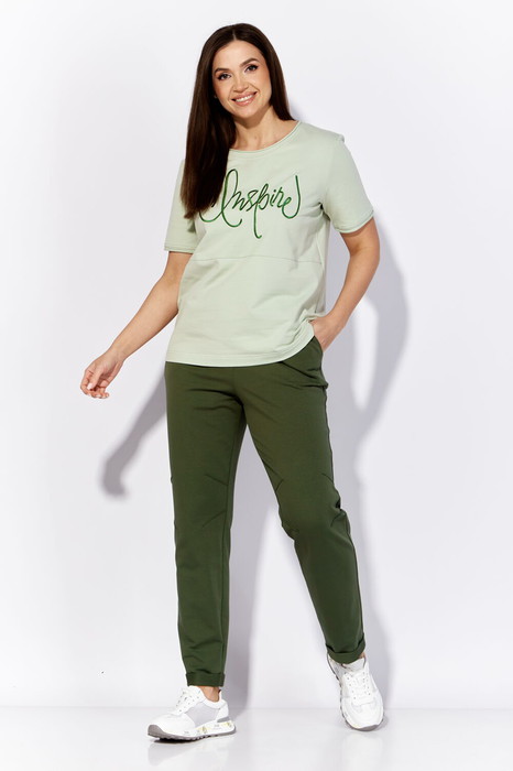 Комплект женский, 2х предметный, состоящий из футболки и брюк. Футболка прямого силуэта с коротким втачным рукавом. Вырез горловины круглой формы. По переду горизонтальный подрез. Верхняя часть задекорирована вышивкой. На спинке акцент в виде нашивки с элементом декоративной тесьмы. Брюки прямые, по низу с отворотом. По переду карманы и частичные защипы в области колена. Пояс притачной с резинкой по кругу и отделочной тесьмой спереди.