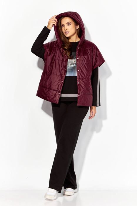 Жилетка прямого силуэта со спущенным рукавом "реглан" По переду рельефы и карманы в рельефах. Спинка и центральная часть переда простеганы. Застежка центральная, на кнопки. Горловина оформлена капюшоном. Низ жилета, по спинке, слегка удлинён. На спинке декоративная нашивка. Жилет изготовлен из плащевой ткани, на синтепоне(VS-100) и на подкладке