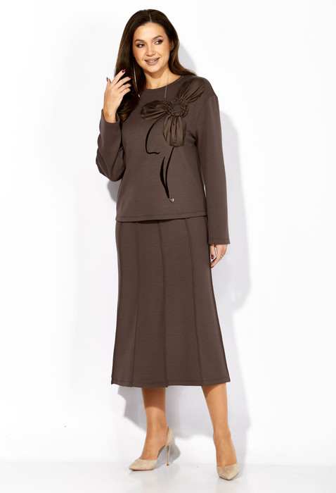 Комплект женский, 2х предметный, из трикотажного полотна "ТЕНСЕЛ", состоящий из джемпера и юбки. Джемпер прямого силуэта с длинным рукавом. Рукав со спущенной линией плеча. Вырез горловины круглой формы с подрезной бейкой. Перед акцентирован принтом и декоративным цветком из отделочной ткани. Юбка чуть расширенная к низу , состоит из десяти клиньев, застроченных на "ребро" в виде рельефов. Пояс притачной с резинкой по кругу.