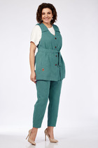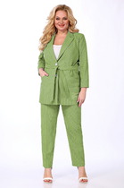 Джемпер свободного кроя выполнен из мягкого, приятного к телу трикотажа , с разрезами и удлинённой спинкой. На переде обработаны нагрудные вытачки. Рукав длинный, втачной. Брюки прямые, выполнены из стрейчевого джинса и экокожи. На передних половинках брюк обработаны внутренние карманы и поперечные швы над уровнем колена, на задних половинках кокетки. Притачной пояс брюк с пуговицей и с резинками в районе боковых швов.