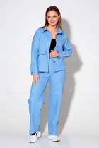 Универсальный трёхпредметный комплект, состоящий из жакета-ветровки, брюк, футболки. Каждый из предметов можно носить отдельно, составляя новые образы. Комфортная футболка со спущенным рукавом выполнена из мягкого вискозного трикотажа. На переде обработаны нагрудные вытачки, декором служит стильный дизайнерский принт.