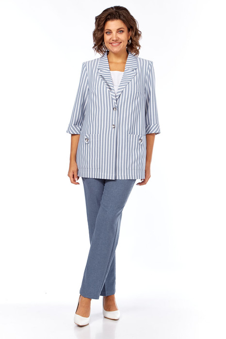 Комплект женский трёхпредметный, состоящий из жакета, брюк и блузы, отлично подойдет как для работы в офисе, так и для свободного времени. Жакет полуприлегающего силуэта с центральной бортовой застёжкой на две петли и пуговицы. На переде обработаны нагрудные вытачки, накладные карманы на уровне бёдер. Стильным акцентом служит печатный принт на лацкане. Спинка со средним швом. В боковых швах обработаны разрезы. Рукав втачной, длиной 3/4, с отложной манжетой. Горловина обработана английским воротником. Брюки прямые, слегка зауженные к низу, на притачном поясе с пуговицей и с резинками в районе боковых швов. На передних половинках обработаны функциональные карманы. Блуза с нагрудными вытачками, без рукавов. Горловина округлой формы. В боковых швах обработаны разрезы. Фурнитура может отличаться от представленной на фото.