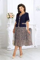 Туника свободного кроя, со спущенной линией плеча. Перед ассиметричный, двухслойный, с нагрудными вытачками и отделочным элементом(съёмный бант). Спинка со средним швом. В боковых швах обработаны разрезы. Рукава втачные, с разрезами, декорированные пришивными украшениями, по низу обработаны манжетами. Горловина округлой формы, так же декорирована пришивными стразами.