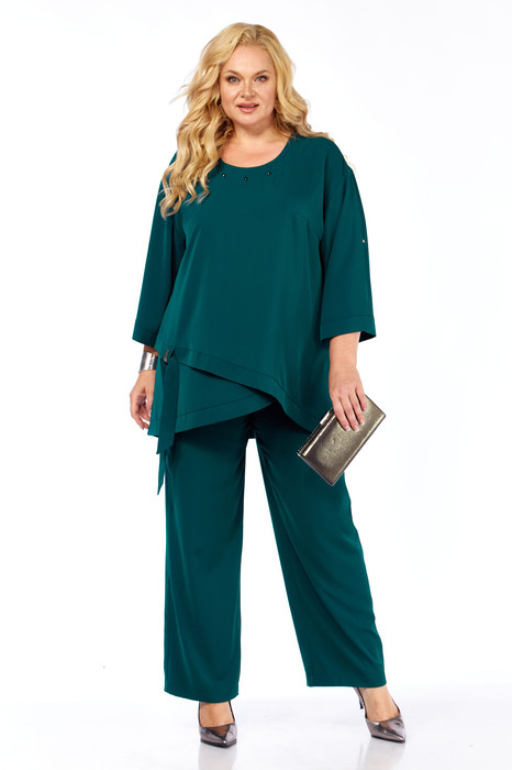 Нарядный женский комплект-двойка, состоящий из туники и брюк, выполнен из струящейся ткани. Ассиметричный крой в сочетании со стильной фурнитурой создаёт яркий притягательный образ для праздничных событий.