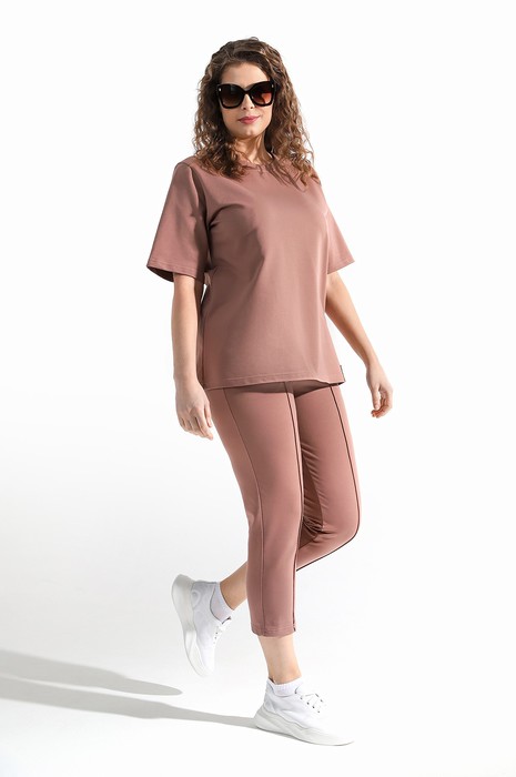 Костюм женский из гладкокрашеного трикотажного полотна футер-двунитка, состоящий из футболки и брюк. Футболка – классического покроя, с короткими втачными рукавами и горловиной овальной формы, обработанной втачной планкой. В нижней части полочки слева настрочен декоративный элемент прямоугольной формы.Брюки – длиной 7/8, слегка зауженные книзу, на притачном поясе с эластичной тесьмой внутри и карманами в боковых швах. Передние половины брюк застрочены по линиям центра вдоль на 0,3 см.