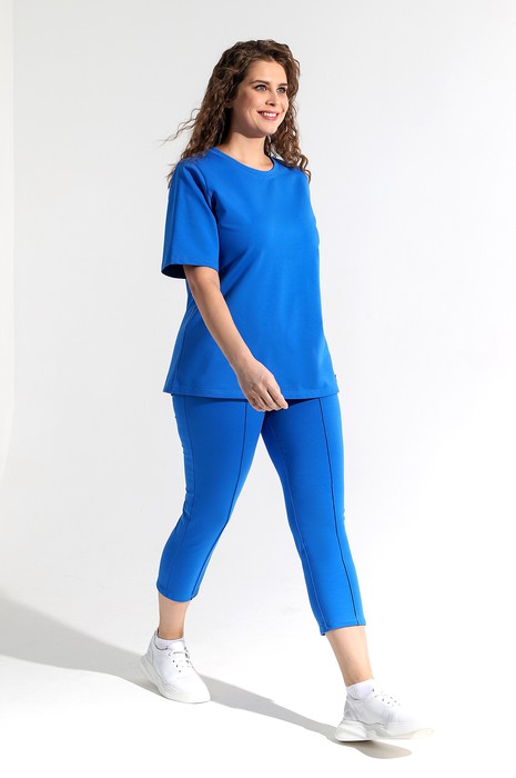 Костюм женский из гладкокрашеного трикотажного полотна футер-двунитка, состоящий из футболки и брюк. Футболка – классического покроя, с короткими втачными рукавами и горловиной овальной формы, обработанной втачной планкой. В нижней части полочки слева настрочен декоративный элемент прямоугольной формы.Брюки – длиной 7/8, слегка зауженные книзу, на притачном поясе с эластичной тесьмой внутри и карманами в боковых швах. Передние половины брюк застрочены по линиям центра вдоль на 0,3 см.