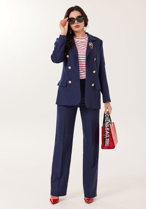 Комплект женский 3-х предметный, состоящий из жакета, брюк и футболки. Жакет и брюки выполнены из поливискозы с добавлением льна. Жакет полуприлегающего силуэта, на подкладке, с двухбортной застежкой  на петли и декоративные пуговицы в морской тематике. Горловина жакета оформлена воротником пиджачного типа, на лацкане которого декоративная брошь. Рукава двухшовные длинные с возможностью подворота длины. В области бедер  обработаны прорезные карманы "в рамку" с клапаном. Спинка со средним швом и рельефами. Брюки классической формы, прямого силуэта, со стрелками по передним и задним половинкам. Верхний срез обработан притачным поясом. По центру переда - застёжка на крючок и тесьму-молнию. На задних половинках расположены талевые выточки, в боковых швах расположены наклонные карманы. Футболка выполнена из трикотажного полотна с принтом "полоска". Футболка прямого силуэта с короткими рукавом, по низу которых - цельнокроенная манжета.