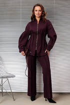 Комплект из двух предметов: блуза и брюки. Блуза женская жакетного типа, полуприлегающего силуэта, выполнена из струящейся поливискозы. Блуза с центральной застёжкой на петли и пуговицы. Горловина оформлена воротником пиджачного типа. Правая деталь переда блузы с нагрудной выточкой, левая - с вертикальным рельефом и подрезом, в области груди обработана декоративная листочка. Спинка цельнокроенная с талиевыми выточками. Рукав втачной длинный, низ рукава обработан притачной манжетой, которая застёгивается на 2 петли и пуговицы. Брюки классической формы, прямого силуэта, со стрелками по передним и задним половинкам. Верхний срез обработан обтачным поясом, дополнен практичными шлевками для ремня. На задних половинках расположены талиевые вытачки с настрочными декоративными листочками. В боковых швах брюк обработаны наклонные карманы. Застёжка центральная на тесьму-молнию и крючок. Брюки комплектуются ремнем.