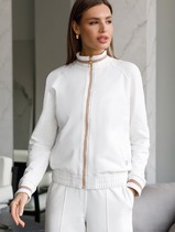 Костюм состоит из жакета и брюк. Качественная поливискоза, из которой выполнена модель, обеспечит долговечность изделию и приятные ощущения его обладательнице. Жакет без подкладки прямого силуэта, с двубортной застежкой на петли-пуговицы, длиной до середины бедра. Перед жакета с нагрудными вытачками, в области груди расположена декоративная листочка. Спинка с двойной кокеткой, в шве притачивания которой обработана встречная складка. Низ жакета фигурный, с закруглениями по боковым швам. Рукава двушовные, длиной 3/4, по низу с манжетой, застегивающейся на петлю и пуговицу. Горловина оформлена воротником пиджачного типа. Брюки классической формы, прямые от линии бедер, со стрелками по передним и задним половинкам. Верхний срез обработан поясом, в который от бокового шва вставлена резинка по задним половинкам. В боковых швах обработаны наклонные карманы. На задних половинках расположены талиевые вытачки. В комплект входит пояс из основной ткани.