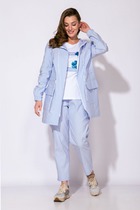 Костюм женский из комбинированных видов ткани, состоит из жакета и юбки. Костюм предназначен для повседневной носки. Жакет женский прямого силуэта из ткани типа шанель с застежкой планкой до верха на 5 петель и пуговиц (размер и цвет фурнитуры может незначительно отличаться от фото), на притачной подкладке. Перед жакета с нагрудными вытачками. На передних половинках жакета, расположены накладные карманы с планкой из отделочной ткани, которые застегиваются на петли пуговицы, верхней части переда и нижней части переда. Спинка со средним швом. Рукава втачные, двухшовные, длинные. Низ рукавов с притачными манжетами из отделочной ткани. Горловина круглой формы, обработана отложным воротником с острыми углами из отделочной ткани. Плечевой пояс с плечевыми накладками. Юбка женская длиной за колено из отделочной ткани, на отлетной подкладке. Перед с двумя бантовыми складками. В боковых швах с переди обработаны карманы с наклонной линией входа. Спинка со средним швом и талиевыми вытачками. В верхней части среднего шва обработана застежка на потайную тесьму-молнию. Верхний край юбки обработан притачным поясом, застегивающимся на одну петлю пуговицу.