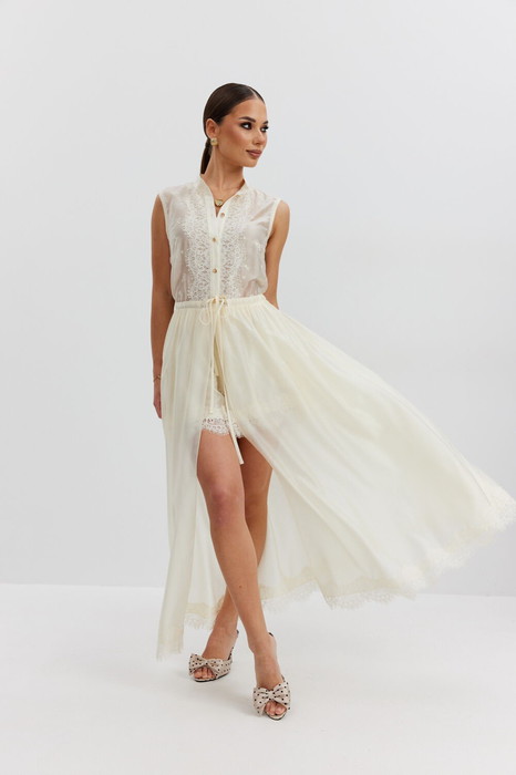 Шорты женские свободного силуэта из полупрозрачной ткани вуаль, высокая посадка, шорты на резинке, пояс притачной со шнуром, боковые карманы в швах. Шорты на подкладке. Низ декорирован кружевом в тон основной ткани. Длина по боковому шву - 34 см. (без пояса)