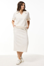 Костюм женский двухпредметный, состоящий из жакета и брюк. Жакет полуприлегающего силуэта с центральной бортовой застёжкой на одну петлю-пуговицу до линии перегиба лацкана. Перед с талиевой вытачкой и прорезным карманом с листочкой с втачными концами. Спинка со средним швом. Рукав втачной двухшовный длинный. Воротник пиджачного типа. Брюки классического кроя, слегка зауженные к низу с притачным поясом с резинкой по задним половинкам брюк. Брюки с наклонным к боковому шву карманом и двумя фигурными хлестиками на одну пуговицу по поясу передних половинок. Застёжка на тесьму - молнию и одну петлю-пуговицу по поясу. Низ брюк имеет фигурную форму - укорочена по передним половинкам и удлинённые по задним. Длина жакета по спинке - 59 см. Длина рукава - 61 см. Длина брюк по боковому шву - 96 см.