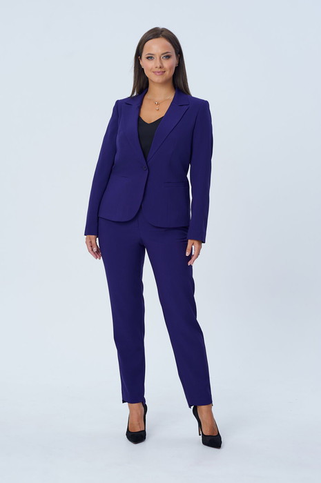 Костюм женский двухпредметный, состоящий из жакета и брюк. Жакет полуприлегающего силуэта с центральной бортовой застёжкой на одну петлю-пуговицу до линии перегиба лацкана. Перед с талиевой вытачкой и прорезным карманом с листочкой с втачными концами. Спинка со средним швом. Рукав втачной двухшовный длинный. Воротник пиджачного типа. Брюки классического кроя, слегка зауженные к низу с притачным поясом с резинкой по задним половинкам брюк. Брюки с наклонным к боковому шву карманом и двумя фигурными хлестиками на одну пуговицу по поясу передних половинок. Застёжка на тесьму - молнию и одну петлю-пуговицу по поясу. Низ брюк имеет фигурную форму - укорочена по передним половинкам и удлинённые по задним. Длина жакета по спинке - 59 см. Длина рукава - 61 см. Длина брюк по боковому шву - 96 см.