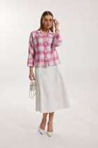 Костюм женский двухпредметный, состоящий из жакета и брюк. Жакет полуприлегающего силуэта с центральной бортовой застёжкой на одну петлю-пуговицу до линии перегиба лацкана. Перед с талиевой вытачкой и прорезным карманом с листочкой с втачными концами. Спинка со средним швом. Рукав втачной двухшовный длинный. Воротник пиджачного типа. Брюки классического кроя, слегка зауженные к низу с притачным поясом с резинкой по задним половинкам брюк. Брюки с наклонным к боковому шву карманом и двумя фигурными хлестиками на одну пуговицу по поясу передних половинок. Застёжка на тесьму - молнию и одну петлю-пуговицу по поясу. Низ брюк имеет фигурную форму - укорочена по передним половинкам и удлинённые по задним. Длина жакета по спинке - 59 см. Длина рукава - 61 см. Длина брюк по боковому шву - 96 см.